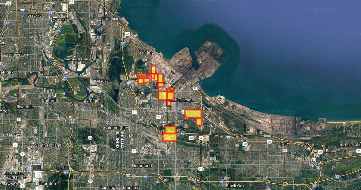 Indianapolis Blvd, BP Whiting Refinery in Whiting with Tanks in Yellow in Indianapolis Blvd, BP Whiting Refinery in Indiana A24