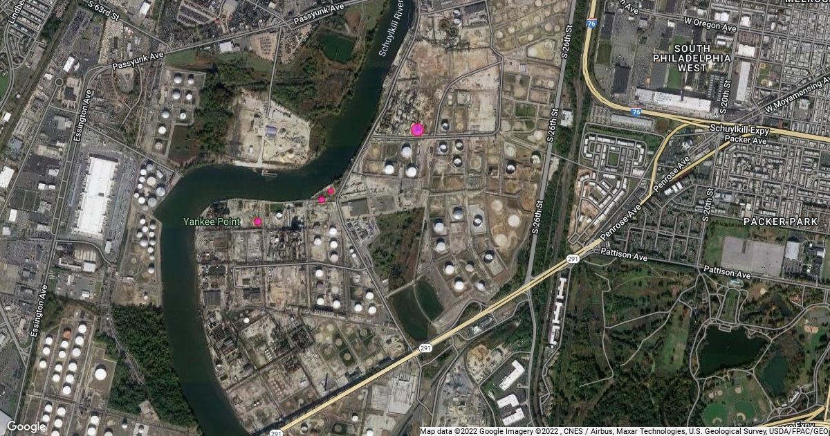 Sun Oil Flare Stacks in Pink in Sun oil Refinery in Pa = Pennsylvania
