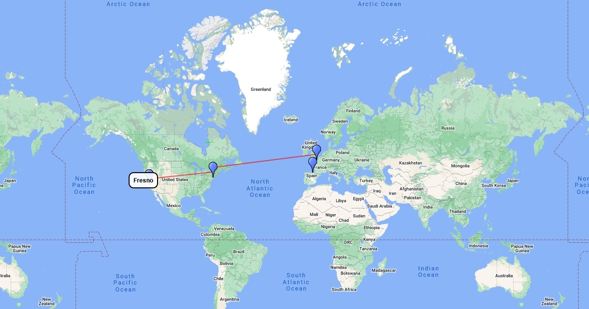 Salida desde Bermeo - Vizcaya. Embarque en El Havre ( Francia) Llegada a New York y viaje en tren hasta Fresno ( California) .