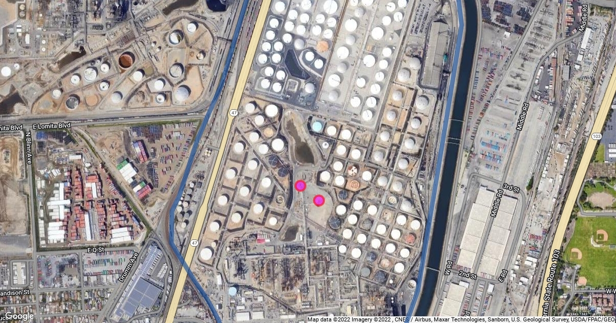 2350 E 223rd St Carson, with Two Huge Tower Flare Stacks each in Pink that is One is Northwest & the other One is Southeast in Facing West of the Lak in Marathon Los Angeles Refinery Main Office California