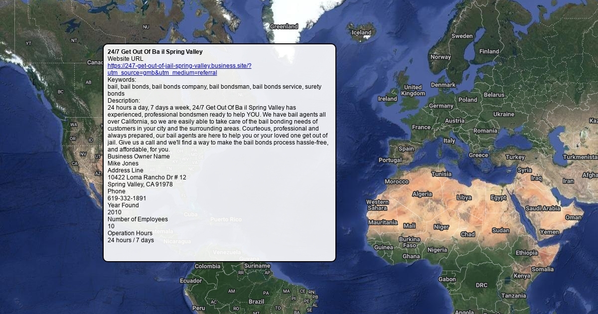 Website URL https://247-get-out-of-jail-spring-valley.business.site/?utm_source=gmb&utm_medium=referral Keywords: bail, bail bonds, bail bonds company, bail bondsman, bail bonds service, surety bonds Description: 24 hours a day, 7 days a week, 24/7 Get Out Of Ba il Spring Valley has experienced, professional bondsmen ready to help YOU. We have bail agents all over California, so we are easily able to take care of the bail bonding needs of customers in your city and the surrounding areas. Courteous, professional and always prepared, our bail agents are here to help you or your loved one get out of jail. Give us a call and we'll find a way to make the bail bonds process hassle-free, and affordable, for you. Business Owner Name Mike Jones Address Line 10422 Loma Rancho Dr # 12 Spring Valley, CA 91978 Phone 619-332-1891 Year Found 2010 Number of Employees 10 ¬Operation Hours 24 hours / 7 days