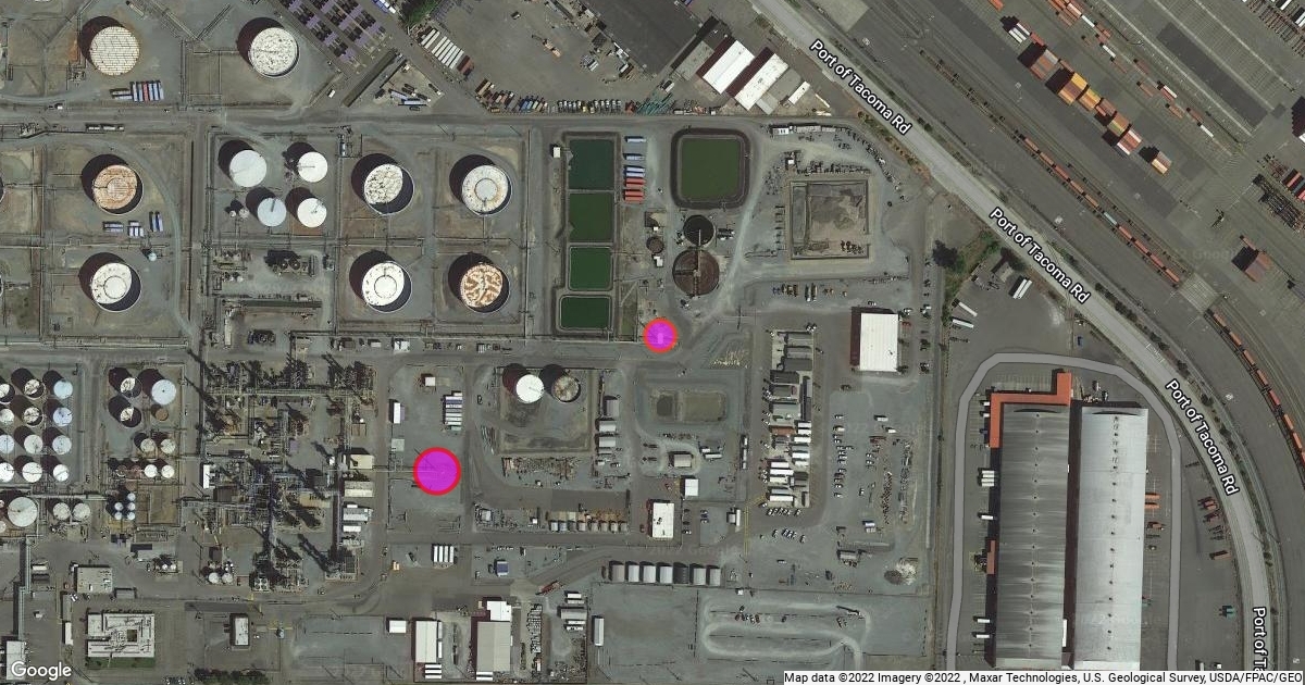 3001 Marshall Ave Tacoma, with Small Pipe Flare Stack Southwest in Pink and Small Pipe Flare stack Northeast