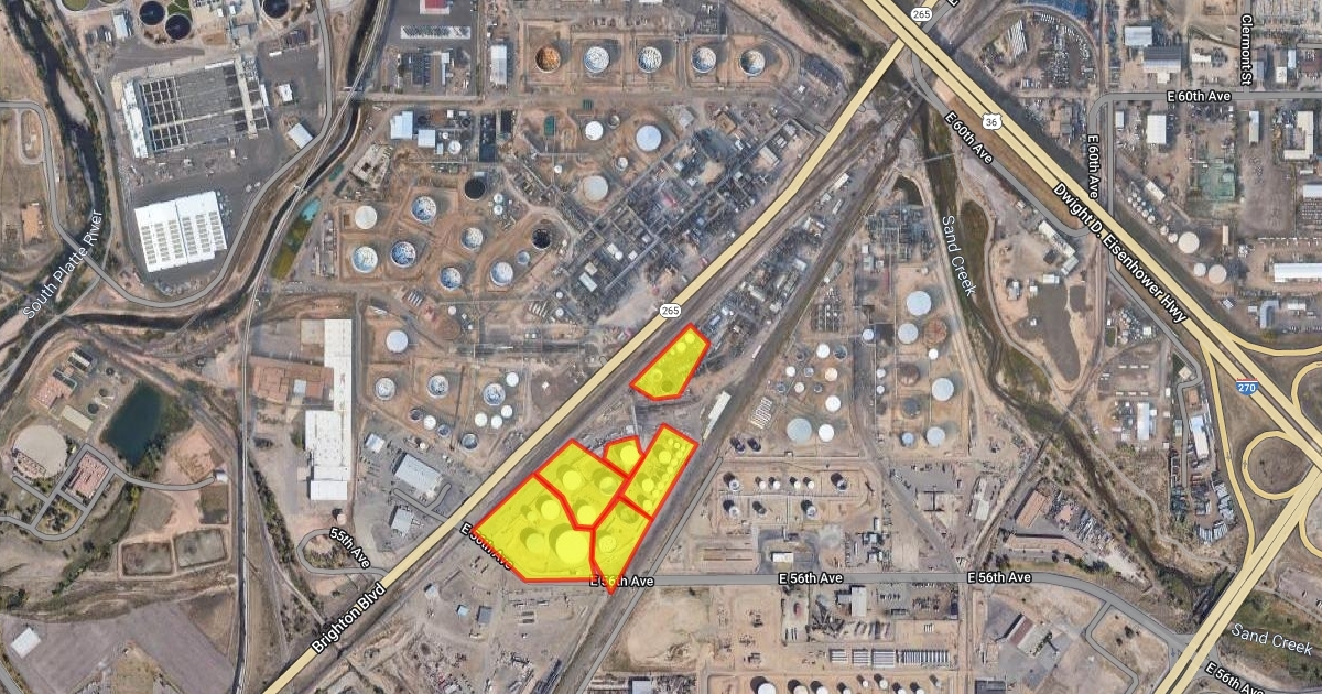 3200 E 56th Ave, Commerce City, with Tanks in Yellow in Commerce City Refinery in Commerce City Near Suncor Visitors Center, in 3200 East 56th Ave Commerce City Colorado A40