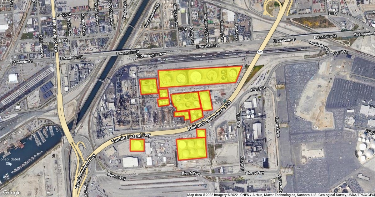 801-, 861 North Pennington Ave, Wilmington, with Tanks in Yellow in north and south of I-103 in North Pennington Wilmington Valero Refinery Main Office in North Pennington Wilmington California A45a