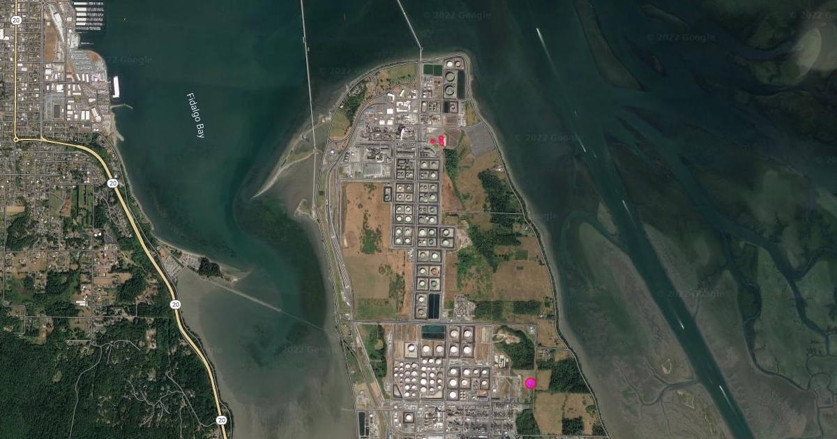 8505 S Texas Rd, Anacortes, with Two Pipe Flare Stacks One Large Flare Stack Northwest in Pink and One Tower Flare Stack East in Pink in Texas Road Ancortes Shell Puget Sound Refinery in Texas Road Ancortes Washington A67