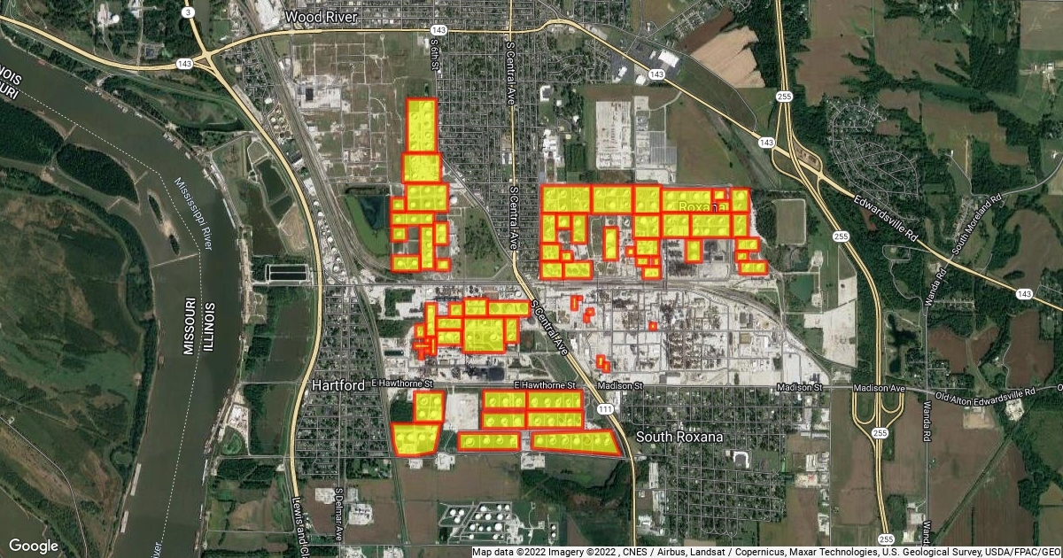 South Central Ave, Roxana, with Tanks in Yellow in South Central Roxana Phillips 66 Refinery in South Central Roxana Ilinios