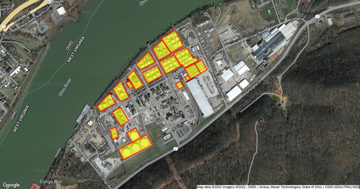 9995 Ohio River Boulevard, Newell, with Tanks in Yellow North and northeast and southwest and West in Ohio River Boulevard Newell Refinery in Ohio River Boulevard Newell