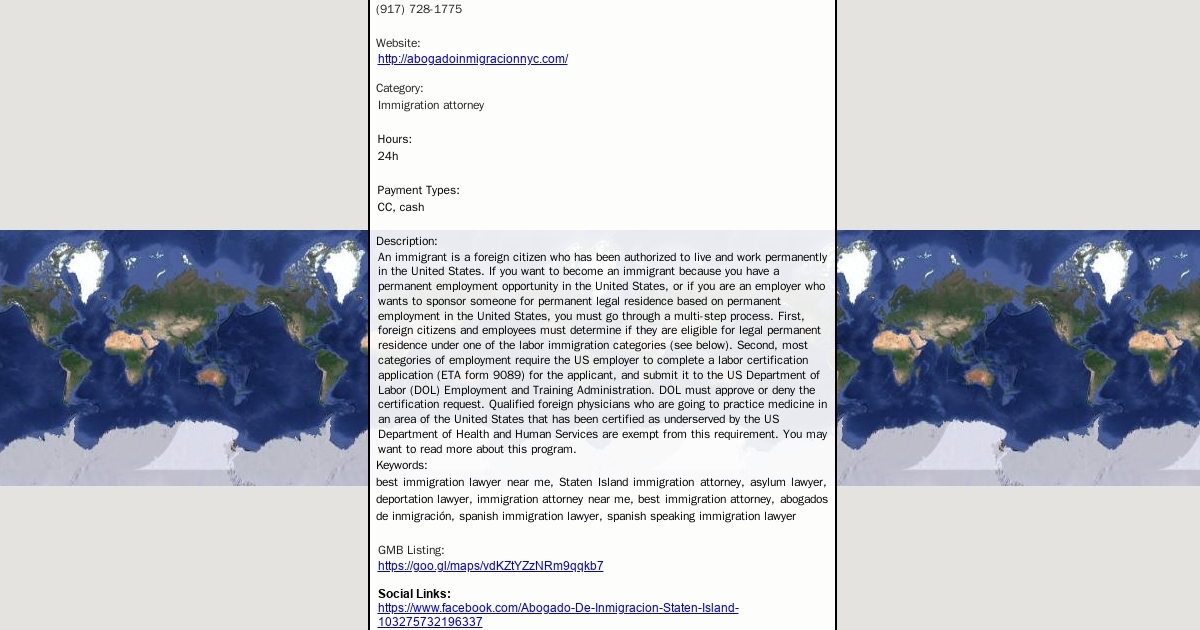 Address: 6400 Amboy Rd Suite 118, Staten Island, NY 10309 Phone: (917) 728-1775 Website: http://abogadoinmigracionnyc.com/ Category: Immigration attorney Hours: 24h Payment Types: CC, cash