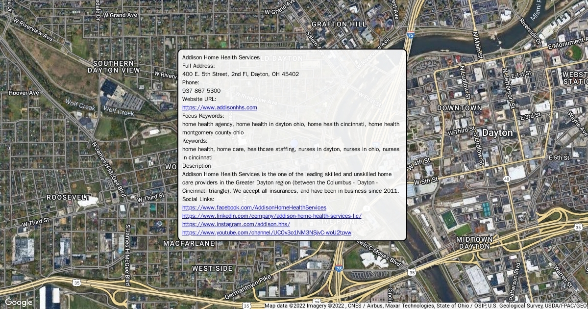Full Address: 400 E. 5th Street, 2nd Fl, Dayton, OH 45402 Phone: 937 867 5300 Website URL: https://www.addisonhhs.com Focus Keywords: home health agency, home health in dayton ohio, home health cincinnati, home health montgomery county ohio
