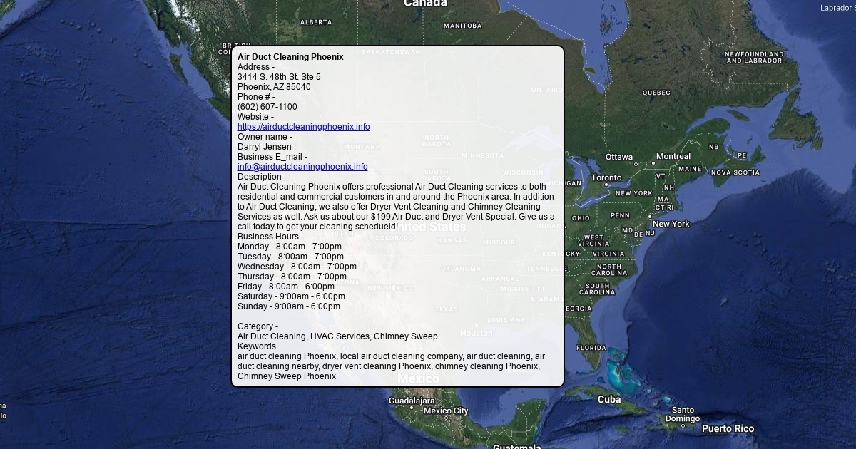 Air Duct Cleaning Phoenix offers professional Air Duct Cleaning services to both residential and commercial customers in and around the Phoenix area. In addition to Air Duct Cleaning, we also offer Dryer Vent Cleaning and Chimney Cleaning Services as well. Ask us about our $199 Air Duct and Dryer Vent Special. Give us a call today to get your cleaning schedueld!