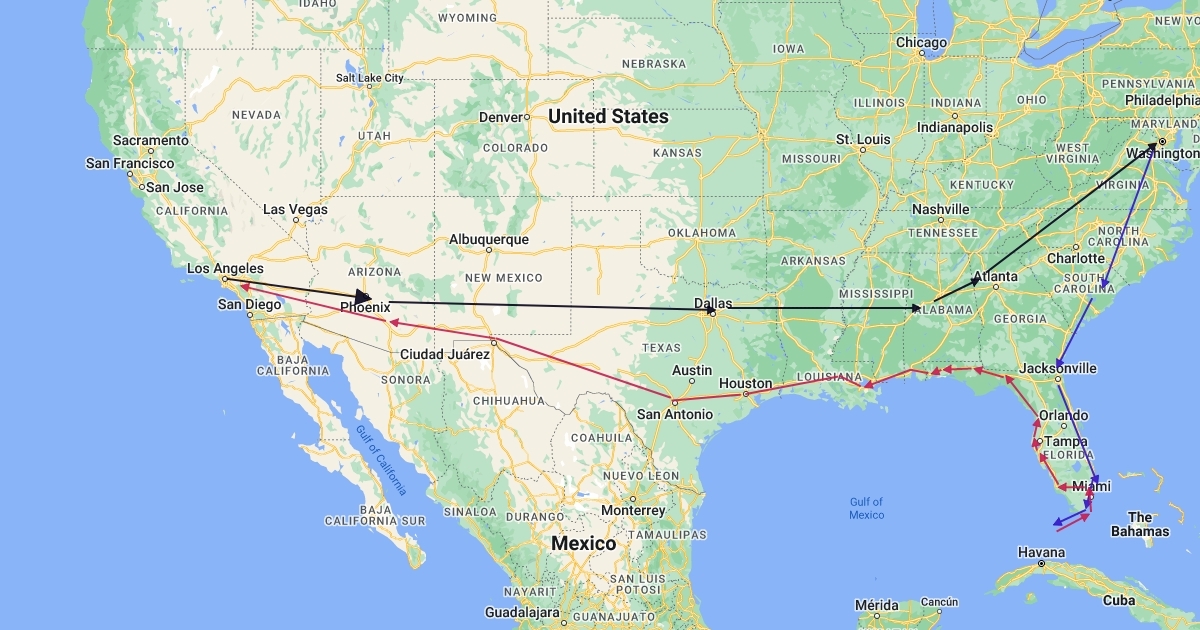 LA to Wash DC for Walk for Life. Then to Key West, back up to New Orleans for Mardi Gras , back to CA