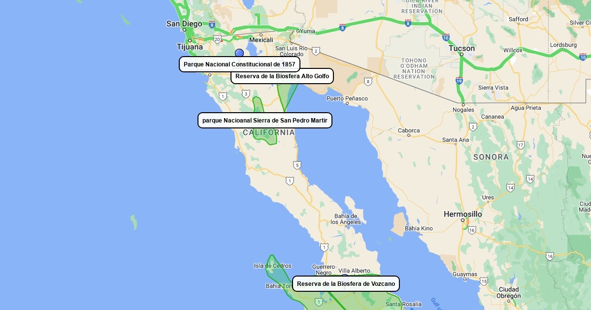 Mapa de Baja California con los nombre de las areas naturales protegidaas encontradas