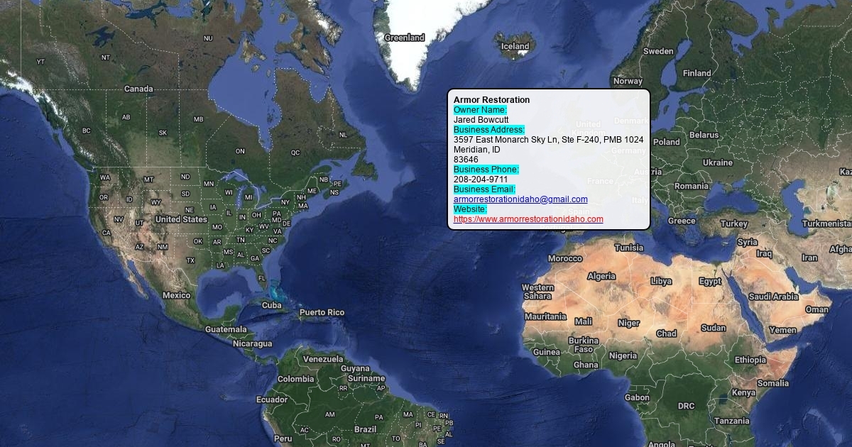 Owner Name: Jared Bowcutt Business Address: 3597 East Monarch Sky Ln, Ste F-240, PMB 1024 Meridian, ID 83646 Business Phone: 208-204-9711 Business Email: armorrestorationidaho@gmail.com Website: https://www.armorrestorationidaho.com