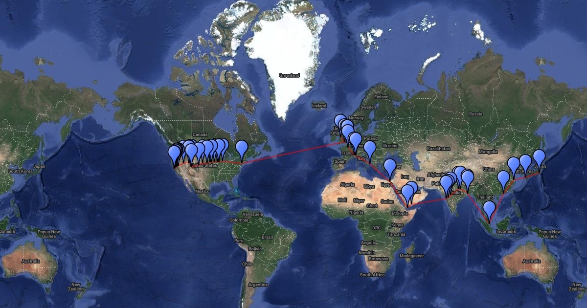Phileas Fogg's mapped 80 day trip around the world.