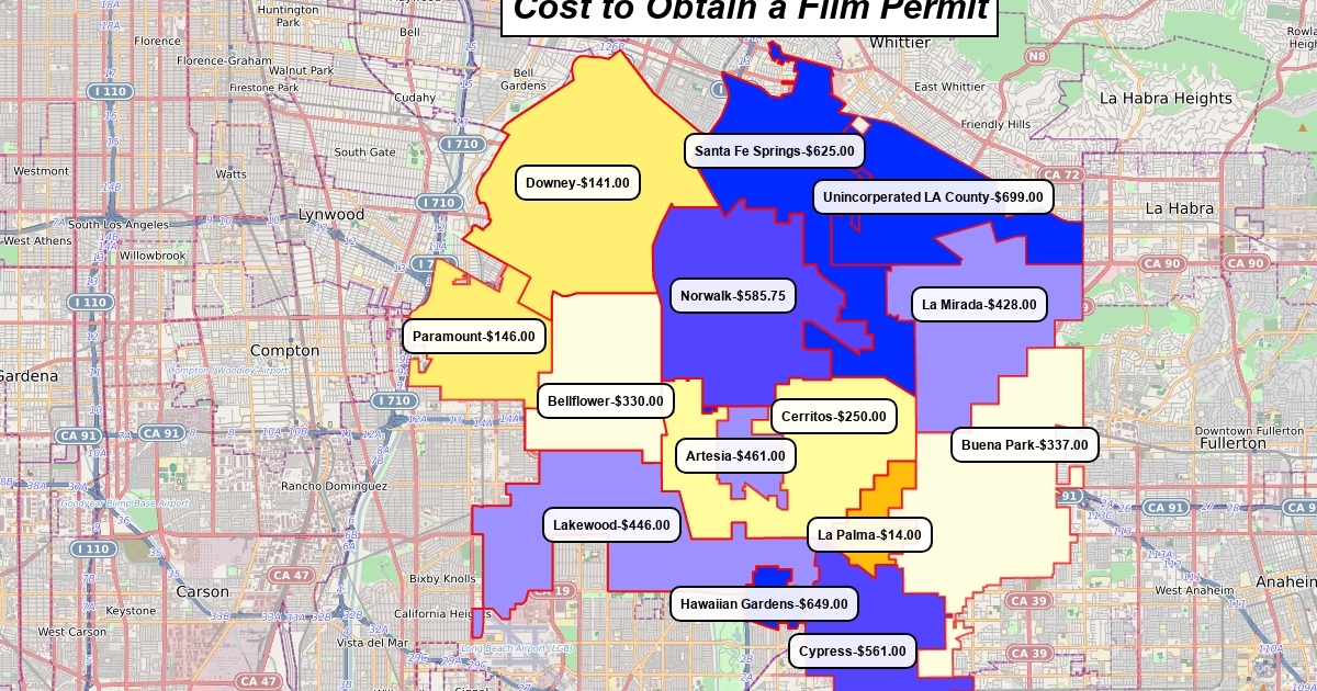 A map of local municipalities and the cost to obtain a film permit in the same.