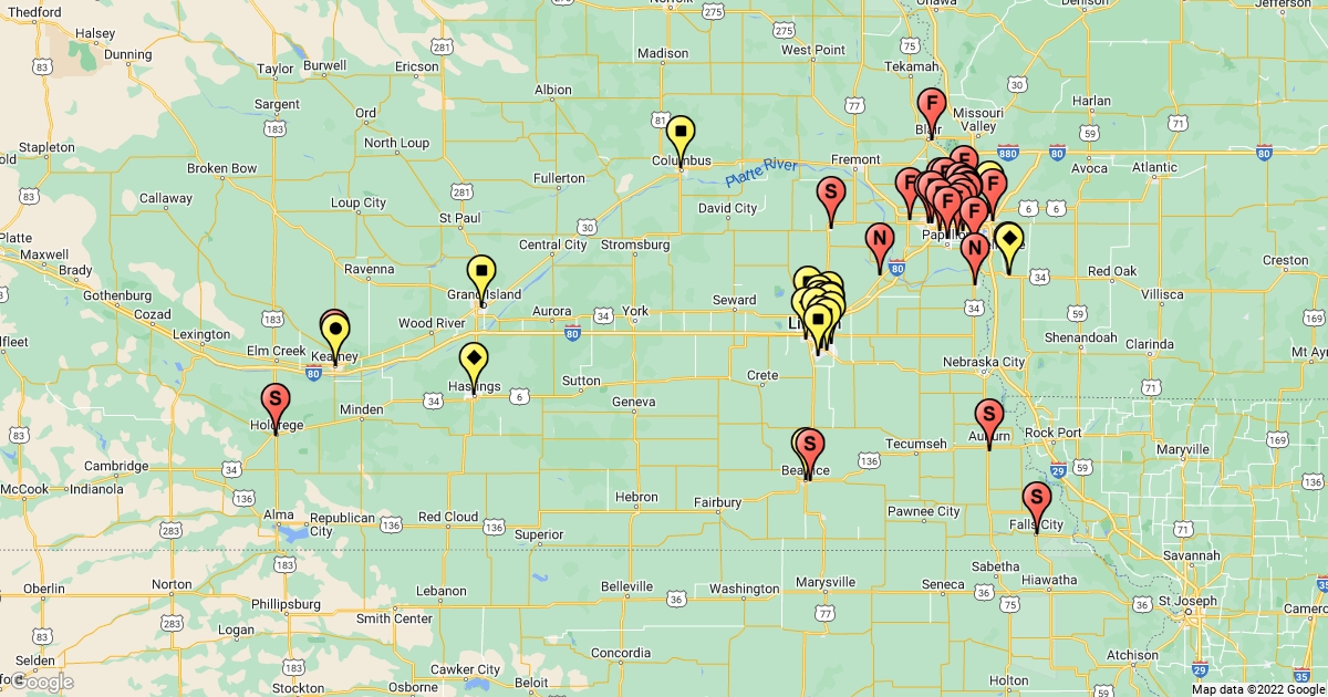 B & R stores (yellow) and SpartanNash retail locations (red)