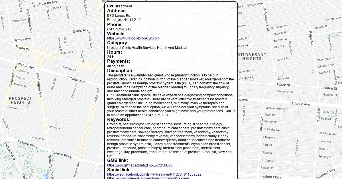 BPH Treatment сlinic specialists have experience diagnosing complex conditions involving enlarged prostate. There are several effective treatments for prostate gland enlargement, including medications, minimally invasive therapies and surgery. To choose the best option, we will consider your symptoms, the size of your prostate, other health conditions you might have and your preferences. Call us to make an appointment: (347) 979-0212.