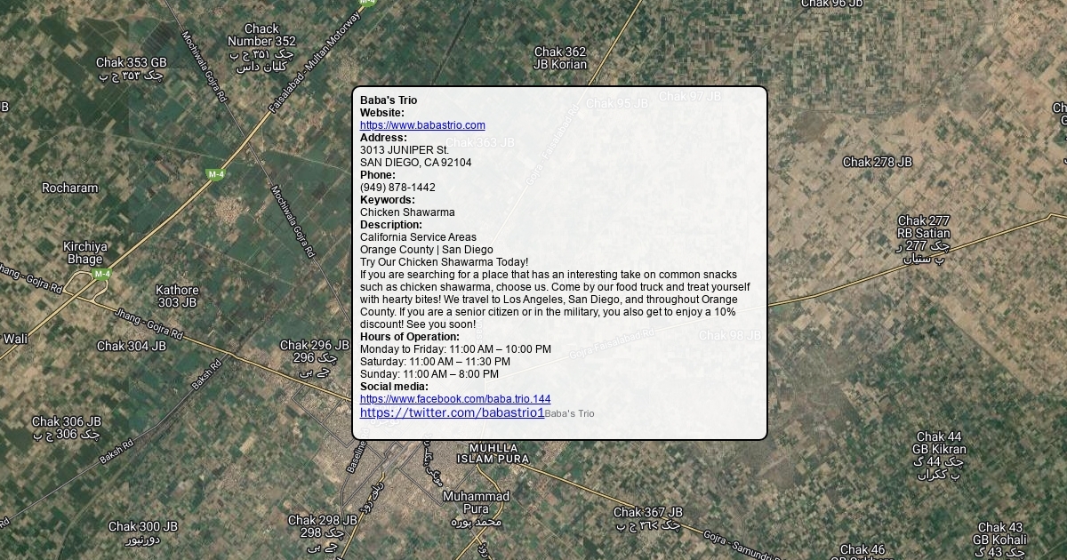 Website: https://www.babastrio.com Address: 3013 JUNIPER St. SAN DIEGO, CA 92104 Phone: (949) 878-1442 Keywords: Chicken Shawarma Description: California Service Areas Orange County | San Diego Try Our Chicken Shawarma Today! If you are searching for a place that has an interesting take on common snacks such as chicken shawarma, choose us. Come by our food truck and treat yourself with hearty bites! We travel to Los Angeles, San Diego, and throughout Orange County. If you are a senior citizen or in the military, you also get to enjoy a 10% discount! See you soon! Hours of Operation: Monday to Friday: 11:00 AM – 10:00 PM Saturday: 11:00 AM – 11:30 PM Sunday: 11:00 AM – 8:00 PM Social media: https://www.facebook.com/baba.trio.144 https://twitter.com/babastrio1Baba's Trio