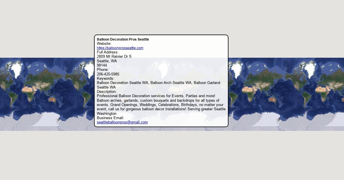 Website: https://balloonprosseattle.com Full Address: 2809 Mt Rainier Dr S Seattle, WA 98144 Phone: 206-420-5985