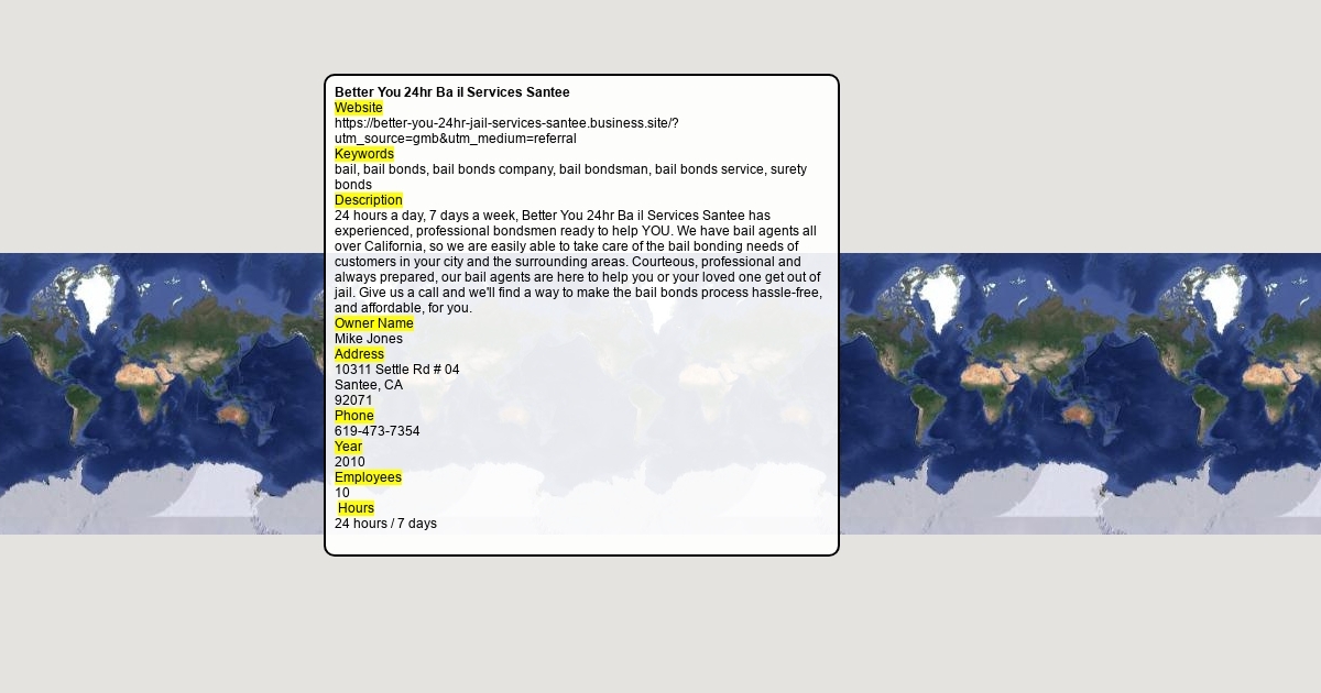 Website https://better-you-24hr-jail-services-santee.business.site/?utm_source=gmb&utm_medium=referral Keywords bail, bail bonds, bail bonds company, bail bondsman, bail bonds service, surety bonds Description 24 hours a day, 7 days a week, Better You 24hr Ba il Services Santee has experienced, professional bondsmen ready to help YOU. We have bail agents all over California, so we are easily able to take care of the bail bonding needs of customers in your city and the surrounding areas. Courteous, professional and always prepared, our bail agents are here to help you or your loved one get out of jail. Give us a call and we'll find a way to make the bail bonds process hassle-free, and affordable, for you. Owner Name Mike Jones Address 10311 Settle Rd # 04 Santee, CA 92071 Phone 619-473-7354 Year 2010 Employees 10 Hours 24 hours / 7 days