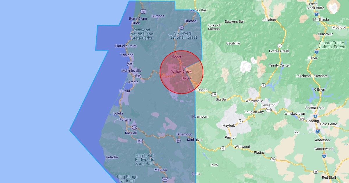 Map of regions of bigfoot sightings in Humboldt County