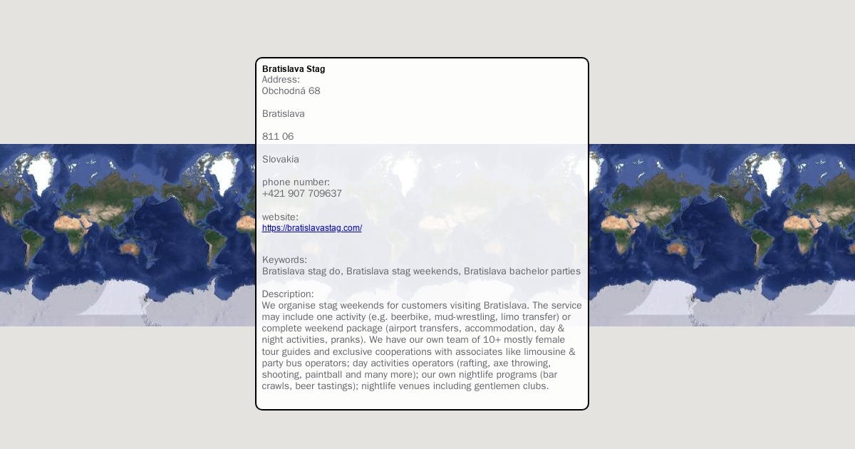 We organise stag weekends for customers visiting Bratislava. The service may include one activity (e.g. beerbike, mud-wrestling, limo transfer) or complete weekend package (airport transfers, accommodation, day & night activities, pranks). We have our own team of 10+ mostly female tour guides and exclusive cooperations with associates like limousine & party bus operators; day activities operators (rafting, axe throwing, shooting, paintball and many more); our own nightlife programs (bar crawls, beer tastings); nightlife venues including gentlemen clubs.