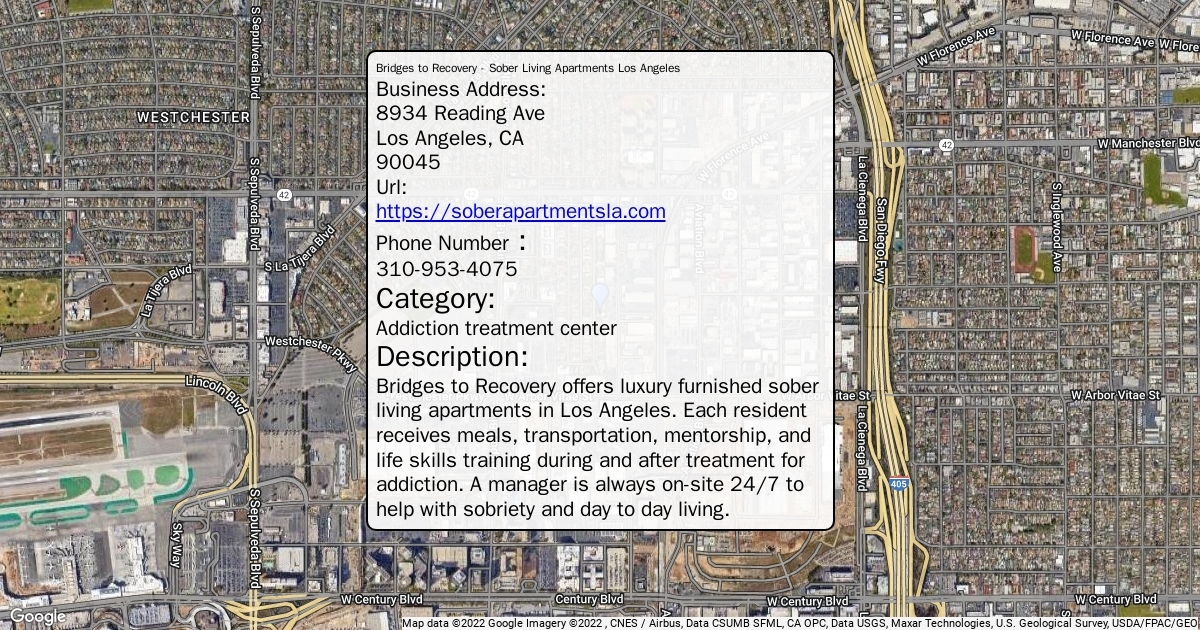 Business Address: 8934 Reading Ave Los Angeles, CA 90045 Url: https://soberapartmentsla.com Phone Number : 310-953-4075 Category: Addiction treatment center Description: Bridges to Recovery offers luxury furnished sober living apartments in Los Angeles. Each resident receives meals, transportation, mentorship, and life skills training during and after treatment for addiction. A manager is always on-site 24/7 to help with sobriety and day to day living.