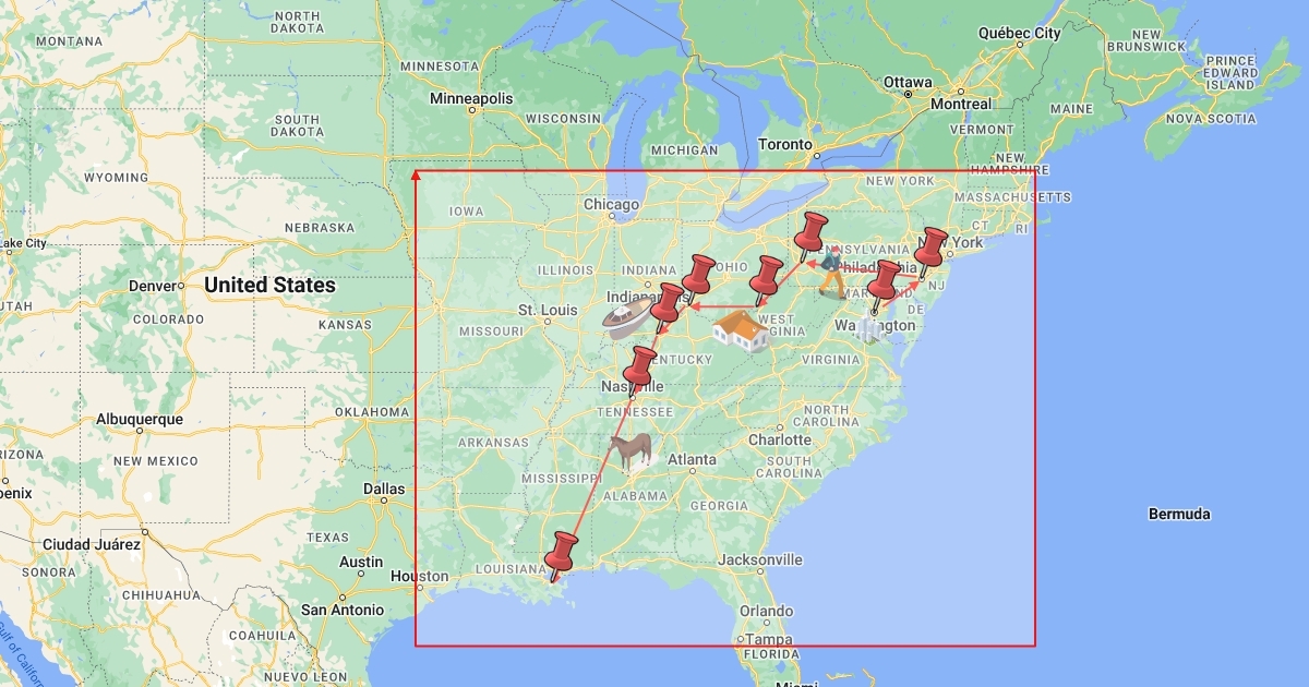 This map shows the route that Burr took from Washington to New Orleans. This is his original trip where he left Washington March of 1805
