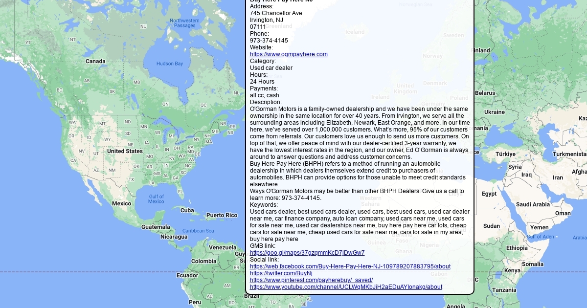 Address: 745 Chancellor Ave Irvington, NJ 07111 Phone: 973-374-4145 Website: https://www.ogmpayhere.com Category: Used car dealer