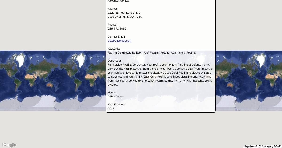 Owner name: Alexander Gomez Address: 1520 SE 46th Lane Unit C Cape Coral, FL 33904, USA Phone: 239-771-3062 Contact Email: alex@caperoof.com