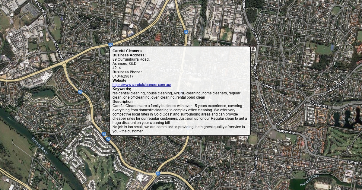 Business Address: 89 Currumburra Road, Ashmore, QLD 4214 Business Phone: 0404629817 Website: https://www.carefulcleaners.com.au/ Keywords; residential cleaning, house cleaning, AirBNB cleaning, home cleaners, regular clean, one off cleaning, oven cleaning, rental bond clean Description: Careful Cleaners are a family business with over 15 years experience, covering everything from domestic cleaning to complex office cleaning. We offer very competitive local rates in Gold Coast and surrounding areas and can provide cheaper rates for our regular customers. Just sign up for our Regular clean to get a huge discount on your cleaning bill. No job is too small, we are committed to providing the highest quality of service to you - the customer.