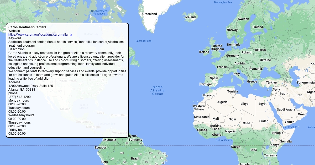 Website https://www.caron.org/locations/caron-atlanta Keyword Addiction treatment center Mental health service,Rehabilitation center,Alcoholism treatment program Description Caron Atlanta is a key resource for the greater Atlanta recovery community, their loved ones, and addiction professionals. We are a licensed outpatient provider for the treatment of substance use and co-occurring disorders, offering assessments, collegiate and young professional programming, teen, family and individual education and counseling. We connect patients to recovery support services and events, provide opportunities for professionals to learn and grow, and guide Atlanta citizens of all ages towards leading a life free of addiction. Address 1200 Ashwood Pkwy, Suite 125 Atlanta, GA, 30338 phone (877) 548-1290 Monday hours 08:00-20:00 Tuesday hours 08:00-20:00 Wednesday hours 08:00-20:00 Thursday hours 08:00-20:00 Friday hours 08:00-20:00