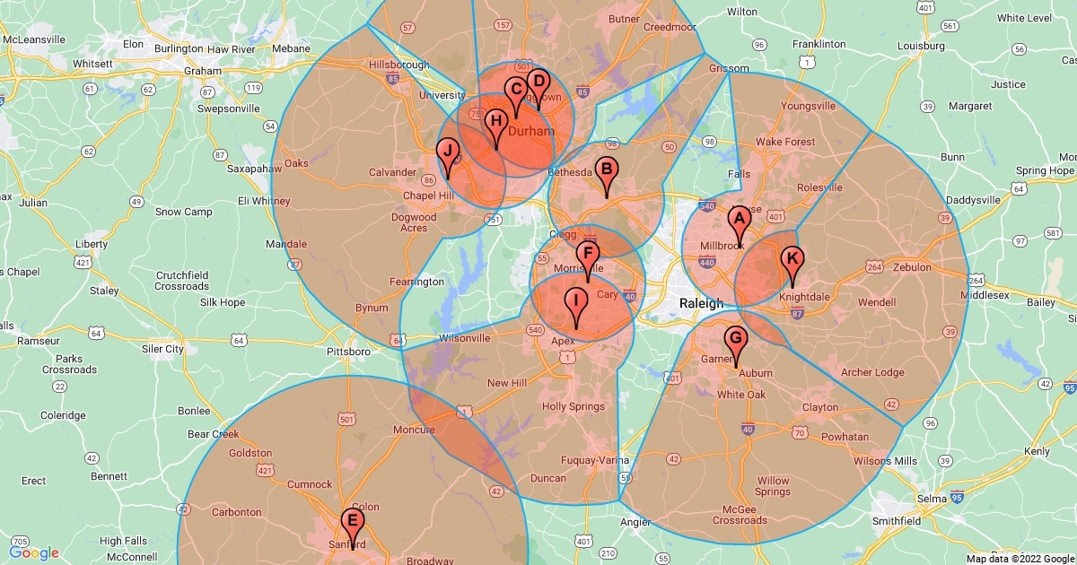 Combination of 5mi radius, with each delivery area expanding out to the 15mi radius