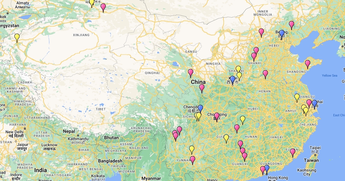 China Map with main locations. Blue - high appeal Purple - mid appeal Yellow - lower appeal