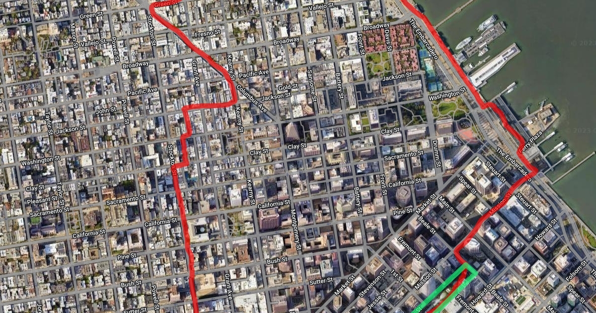 Loop through: ferry building, embarcadero, coit tower, north beach, chinatown, union square, soma, transbay terminal