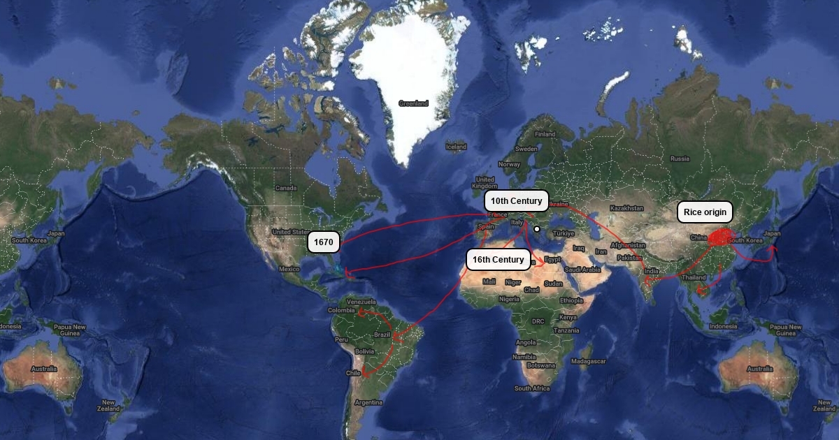 The diffusion of rice across the world in during the Columbian exchange