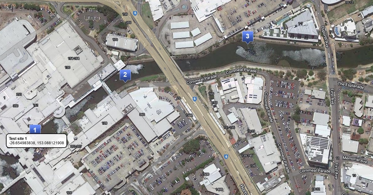 A view of the testing portion of Cornmeal Creek with test sites marked.