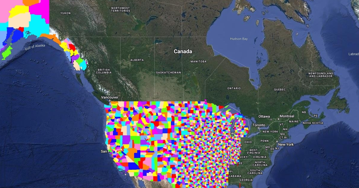 Every county, in bright colorful tones. Makes for a very appealing mosaic.