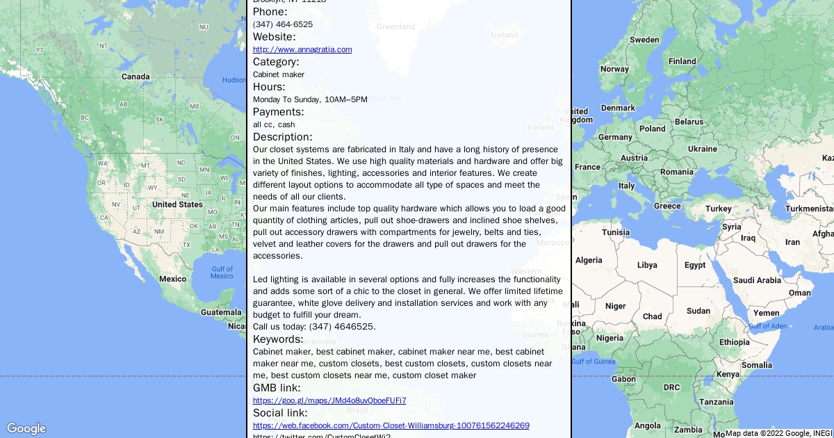 Address: 3908 Fort Hamilton Pkwy, Brooklyn, NY 11218 Phone: (347) 464-6525 Website: http://www.annagratia.com Category: Cabinet maker Hours: Monday To Sunday, 10AM–5PM Payments: all cc, cash