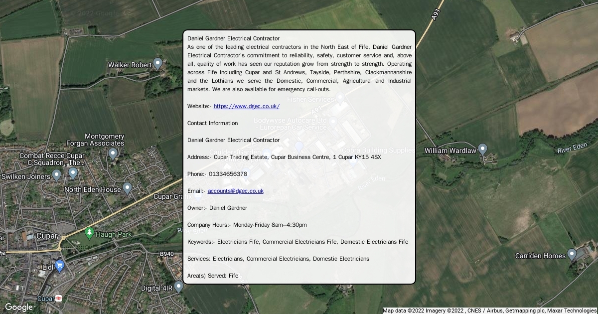 As one of the leading electrical contractors in the North East of Fife, Daniel Gardner Electrical Contractor’s commitment to reliability, safety, customer service and, above all, quality of work has seen our reputation grow from strength to strength. Operating across Fife including Cupar and St Andrews, Tayside, Perthshire, Clackmannanshire and the Lothians we serve the Domestic, Commercial, Agricultural and Industrial markets. We are also available for emergency call-outs.