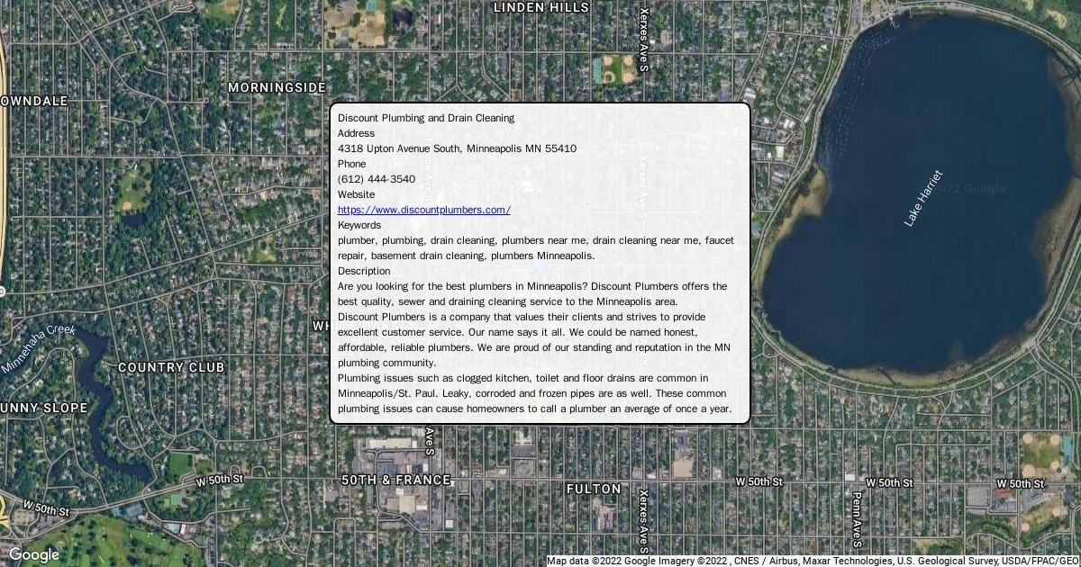 Address 4318 Upton Avenue South, Minneapolis MN 55410 Phone (612) 444-3540 Website https://www.discountplumbers.com/ Keywords plumber, plumbing, drain cleaning, plumbers near me, drain cleaning near me, faucet repair, basement drain cleaning, plumbers Minneapolis. Description Are you looking for the best plumbers in Minneapolis? Discount Plumbers offers the best quality, sewer and draining cleaning service to the Minneapolis area. Discount Plumbers is a company that values their clients and strives to provide excellent customer service. Our name says it all. We could be named honest, affordable, reliable plumbers. We are proud of our standing and reputation in the MN plumbing community. Plumbing issues such as clogged kitchen, toilet and floor drains are common in Minneapolis/St. Paul. Leaky, corroded and frozen pipes are as well. These common plumbing issues can cause homeowners to call a plumber an average of once a year.