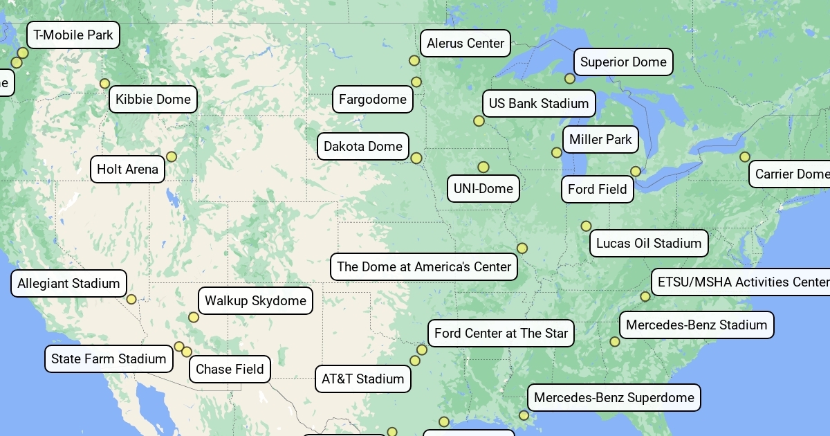 A map of domed facilities in the United States that can host football games and spectators.