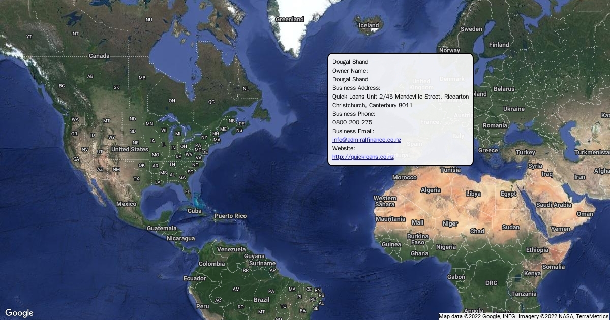 Owner Name: Dougal Shand Business Address: Quick Loans Unit 2/45 Mandeville Street, Riccarton Christchurch, Canterbury 8011 Business Phone: 0800 200 275 Business Email: info@admiralfinance.co.nz Website: http://quickloans.co.nz