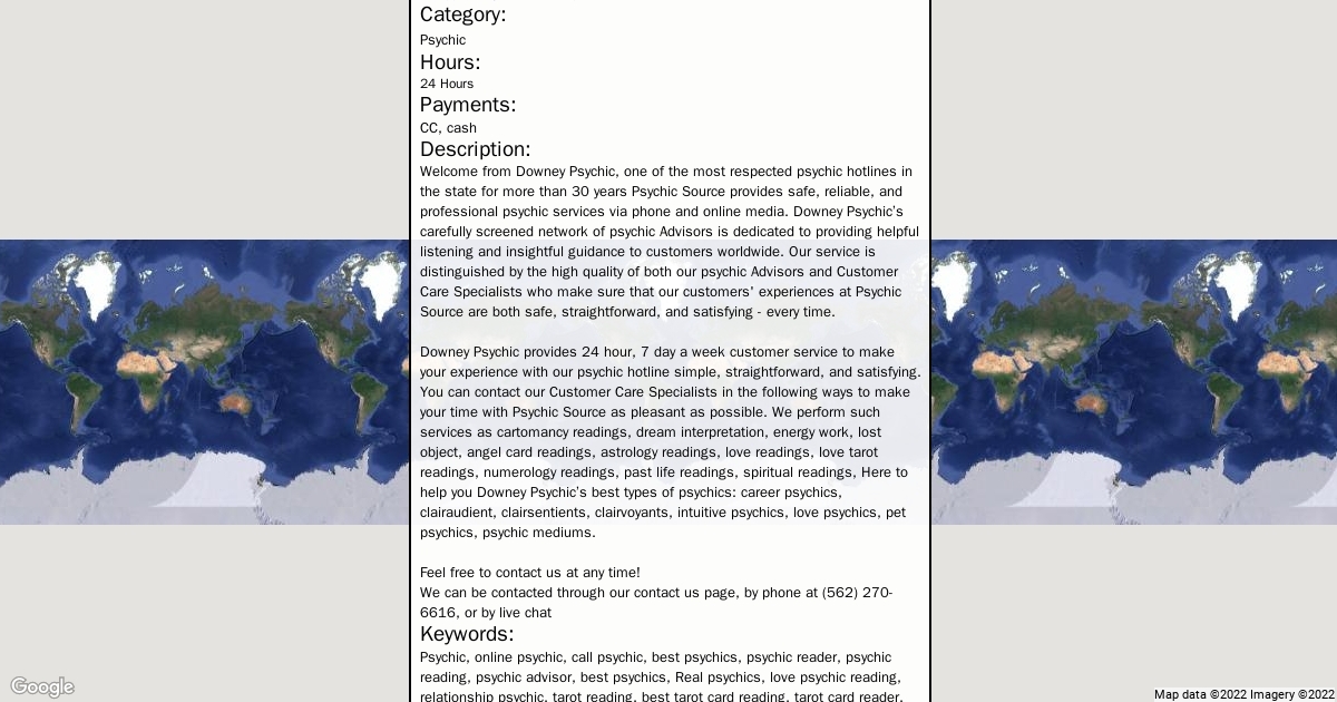 Address: 9521 Lakewood Blvd #580 Downey, CA 90240 Phone: (562) 270-6616 Website: http://callpsychicnow.com/ Category: Psychic Hours: 24 Hours Payments: CC, cash