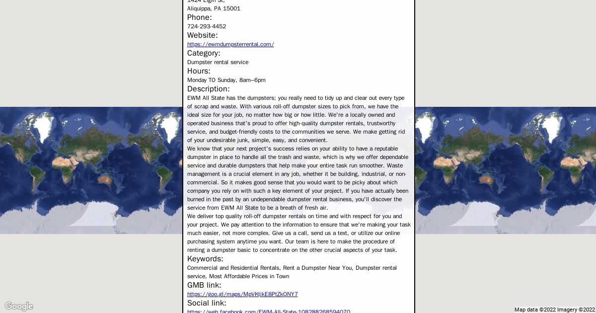 Address: 1424 Elgin St, Aliquippa, PA 15001 Phone: 724-293-4452 Website: https://ewmdumpsterrental.com/ Category: Dumpster rental service Hours: Monday TO Sunday, 8am–6pm