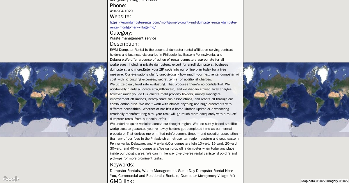 Address: 9690 Montgomery Village Ave, Montgomery Village, MD 20886 Phone: 410-204-1029 Website: https://ewmdumpsterrental.com/montgomery-county-md-dumpster-rental/dumpster-rental-montgomery-village-md/ Category: Waste management service