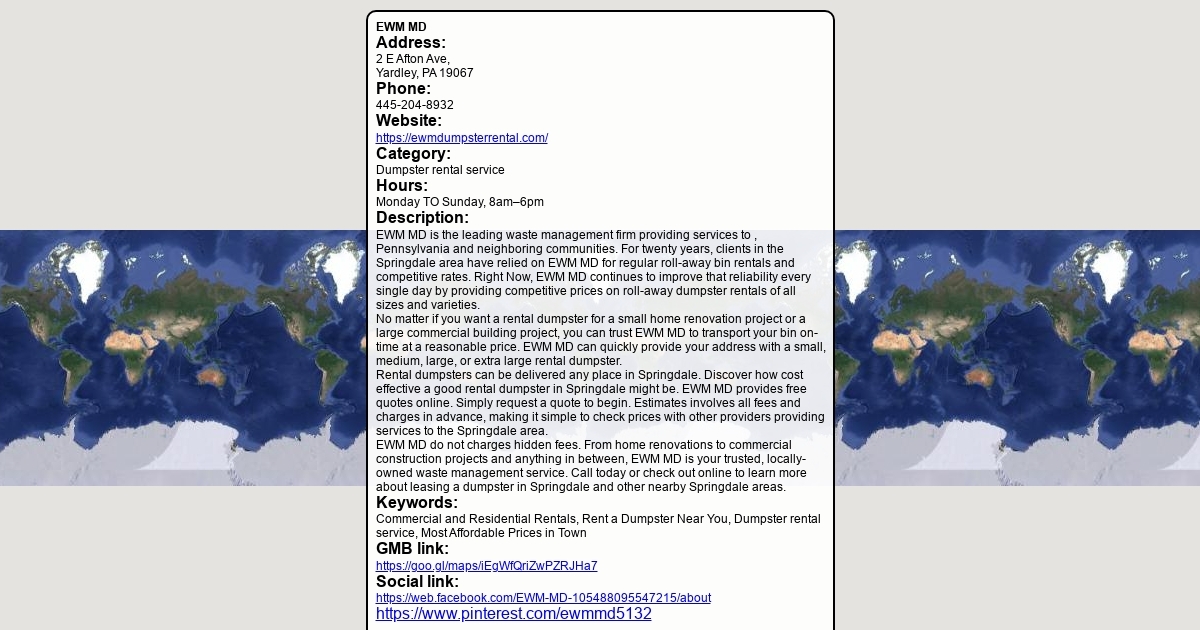Address: 2 E Afton Ave, Yardley, PA 19067 Phone: 445-204-8932 Website: https://ewmdumpsterrental.com/ Category: Dumpster rental service Hours: Monday TO Sunday, 8am–6pm