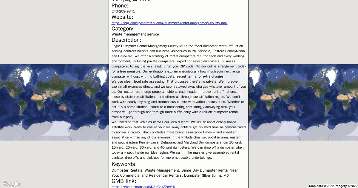 Address: 8510 Springvale Rd, Silver Spring, MD 20910 Phone: 240-209-9841 Website: https://eagledumpsterrental.com/dumpster-rental-montgomery-county-md/ Category: Waste management service
