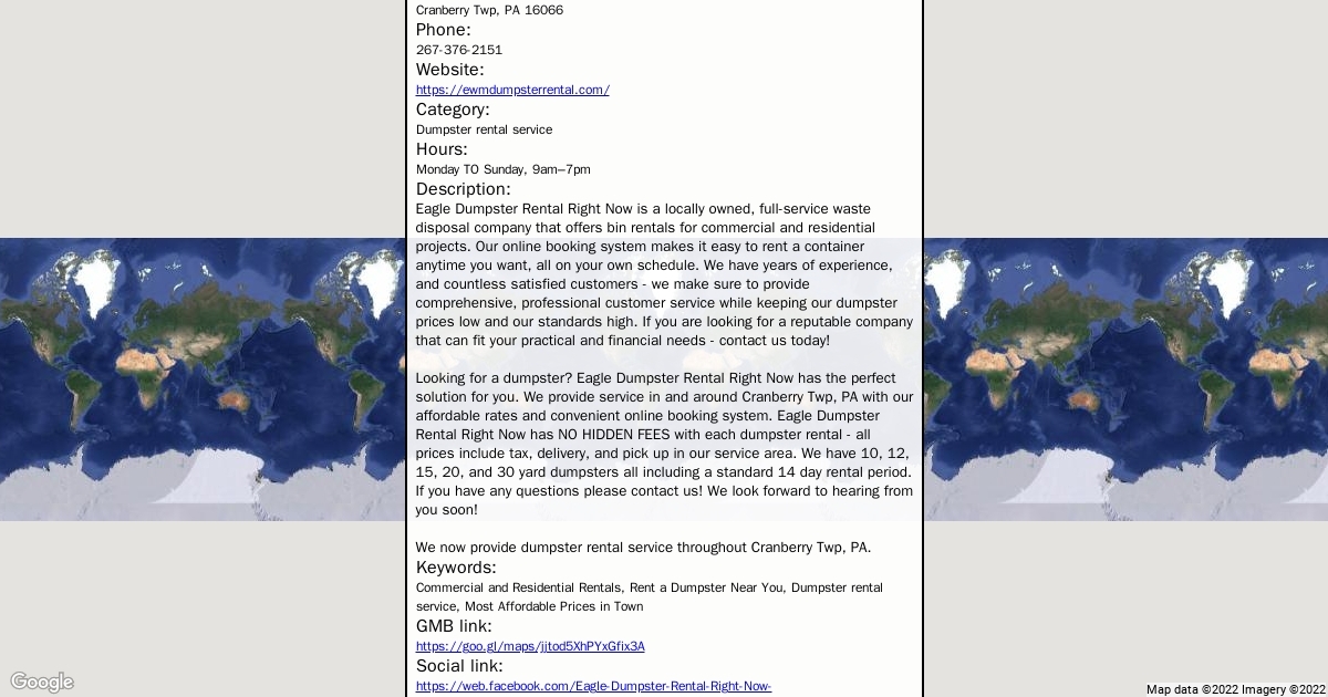 Address: 1717 PA-228, Cranberry Twp, PA 16066 Phone: 267-376-2151 Website: https://ewmdumpsterrental.com/ Category: Dumpster rental service Hours: Monday TO Sunday, 9am–7pm