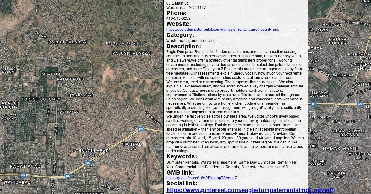 Address: 63 E Main St, Westminster, MD 21157 Phone: 410-593-3259 Website: https://eagledumpsterrental.com/dumpster-rental-carroll-county-md/ Category: Waste management service